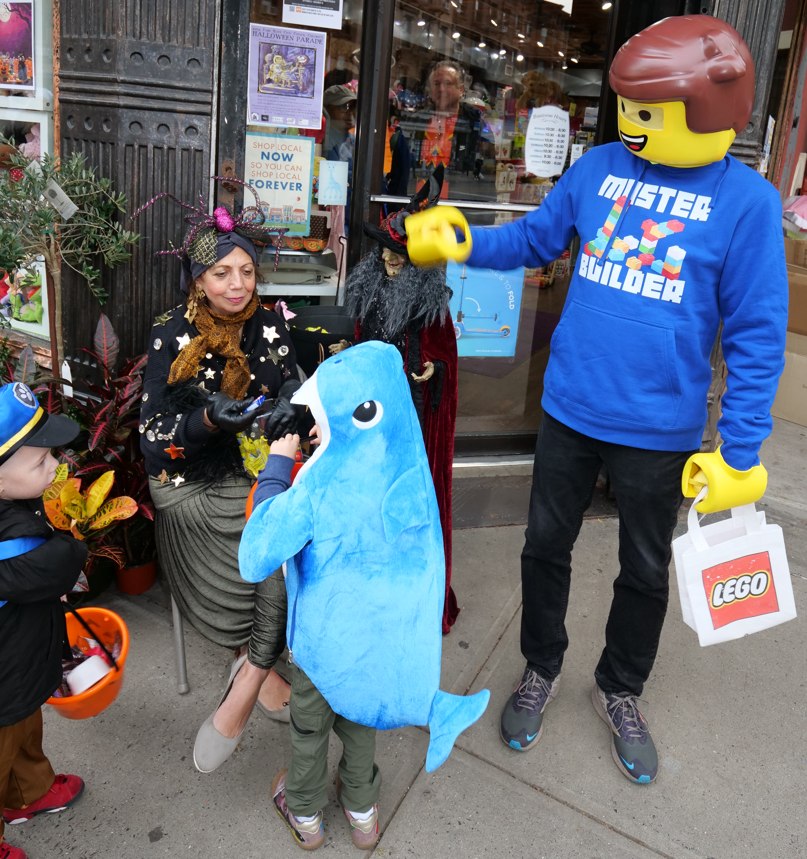 4:37 PM. In front of Little Things Toy Store. Shelley is sitting. Then a shark. Legoman Master Builder is at the right.