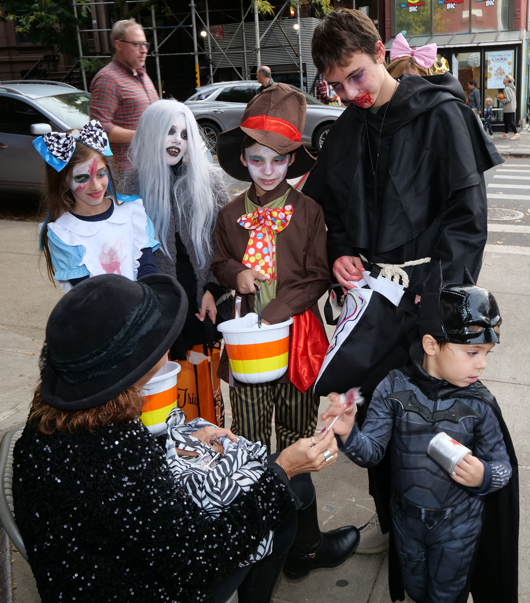 5:10 PM. Shelley giving out lollipops to: Alice in Zombieland, a zombie, a clown scarecrow, a vampire monk, and a little Batman.