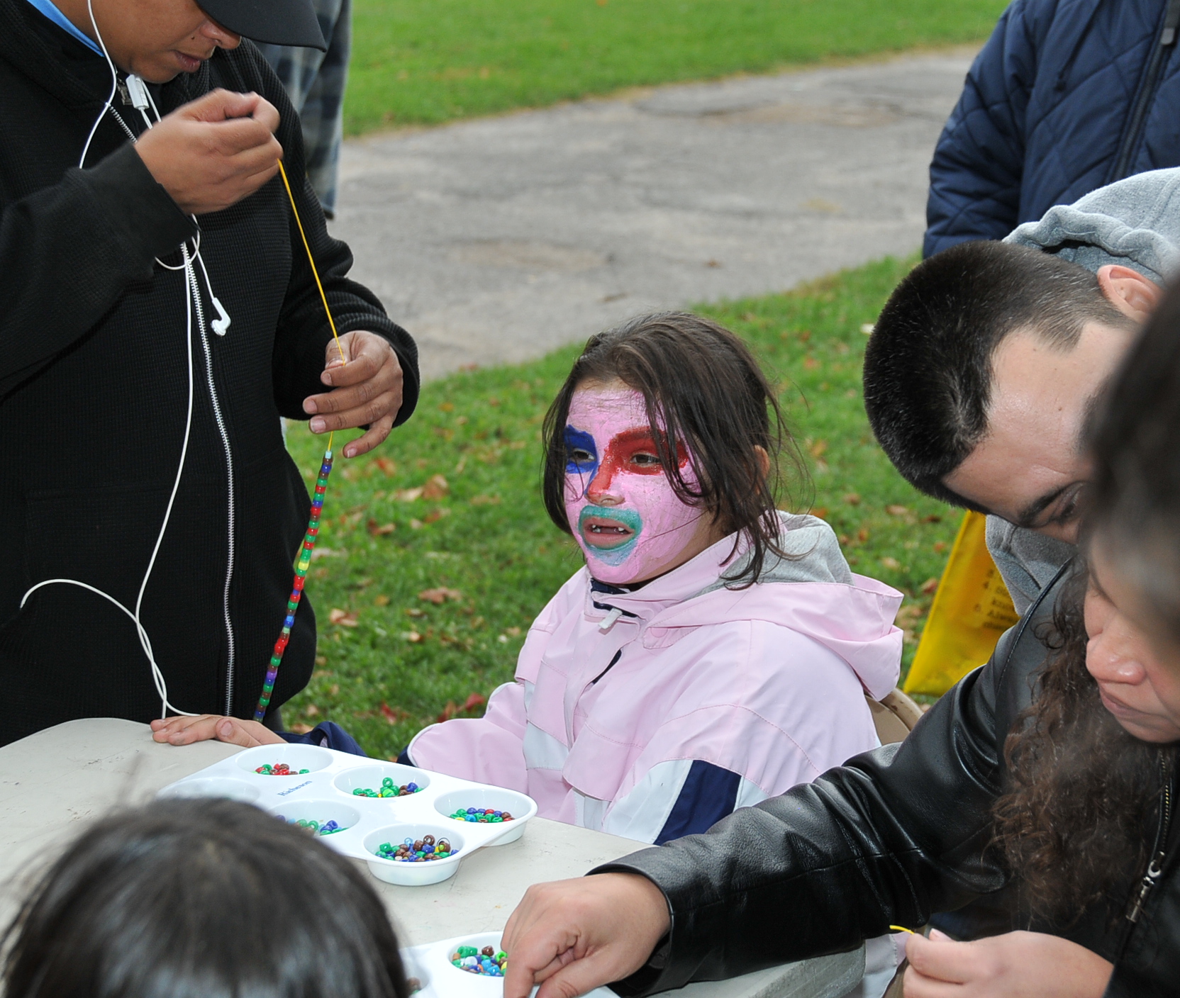 1:51 PM. Bead stringing. The girl with a lot of face paint.