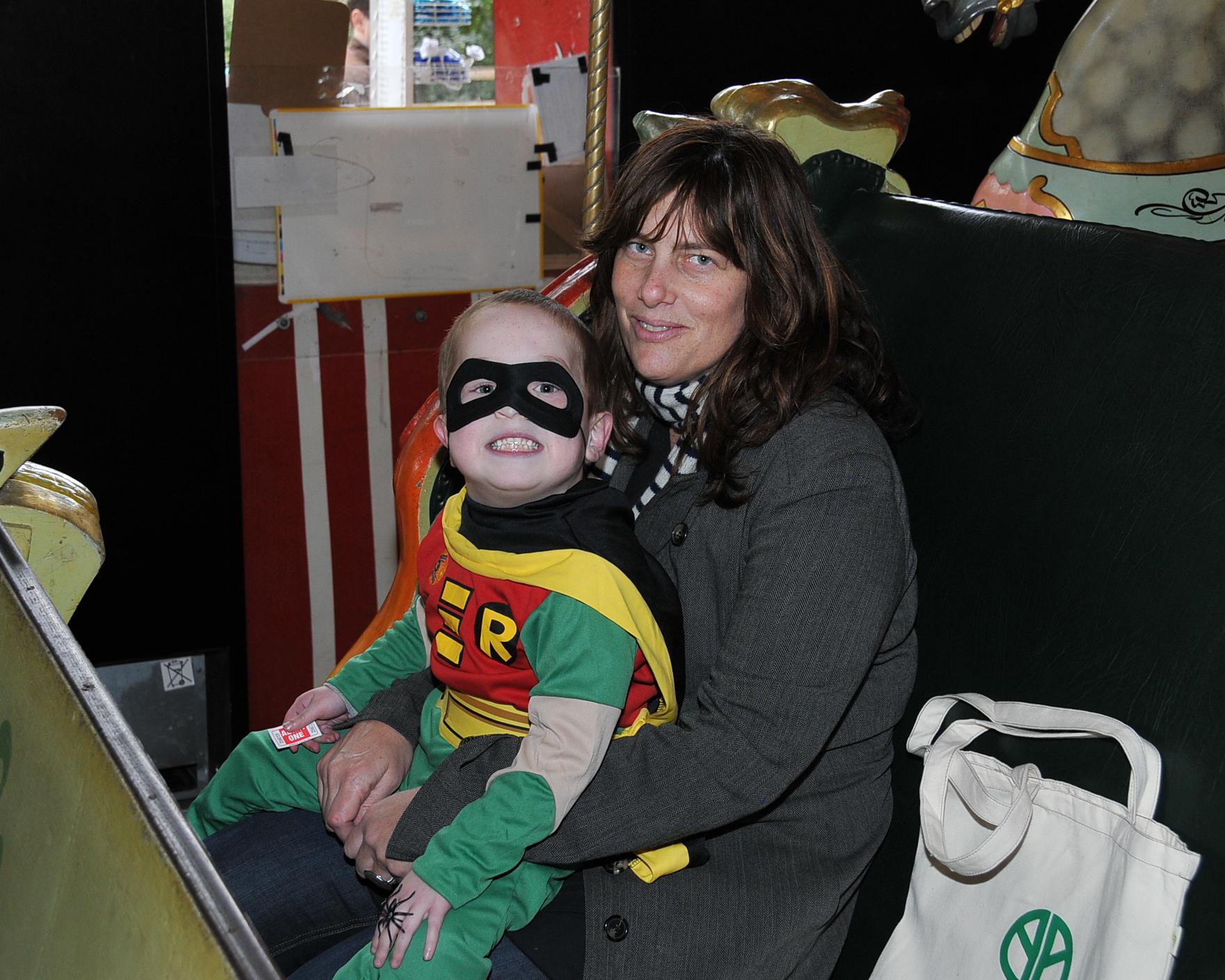 A fellow in his Robin costume (Batman's partner), with his mother riding the Carousel.