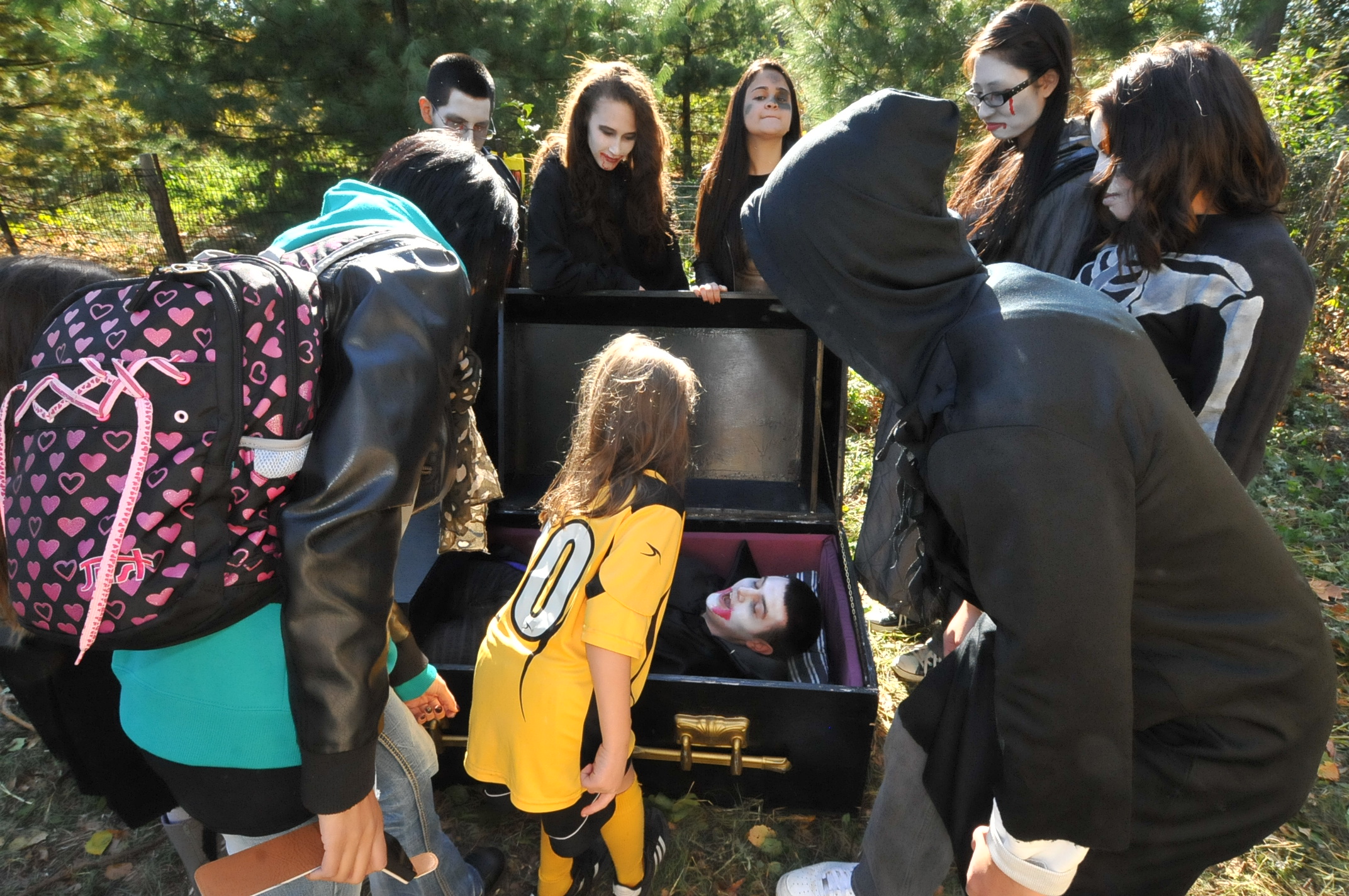 2:32 PM. People looking into a vampire sleeping in his coffin.